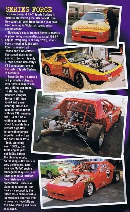Centreline RX7's, The silver one Chris Muscat owns and raced was probably the fastest NA20B in Aus? which ran with Youlden at the wheel on a few occasions. This car still resides in Muscats hands but never appears. Luke Chambers car was the Rod Newbound RX7 which the Chambers family bought and have run ever since with a 20B, the car of course is now Yellow. This car is pretty active at a state level.